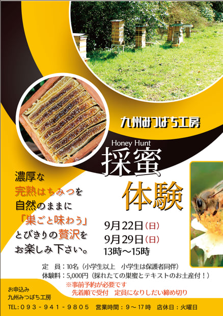 北九州市でニホンミツバチの採蜜体験イベントを行います 9月22日(日)29日(日)9/4より先着順で受付 13:00~15:00(小雨決行) 参加費5千円【初心者用養蜂テキスト(非売品)巣蜜のお土産つき】 県外からの参加者もいらっしゃる程毎年大人気のイベントです お申し込みは九州みつばち工房(093-941-9805)までお電話下さい...