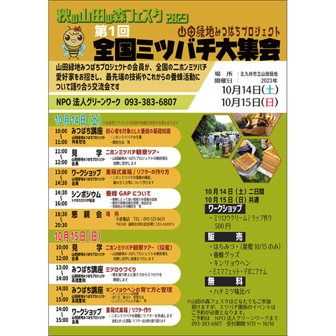 2023年10月14日15日の二日間「全国ミツバチ大集会」を、北九州市立山田緑地の「山田の森フェスタ」内で開催します。 山田緑地みつばちプロジェクトの会員が、全国の二ホンミツバチ愛好家をお招きし、最先端の技術やこれからの養蜂活動について語り合う交流会です。...